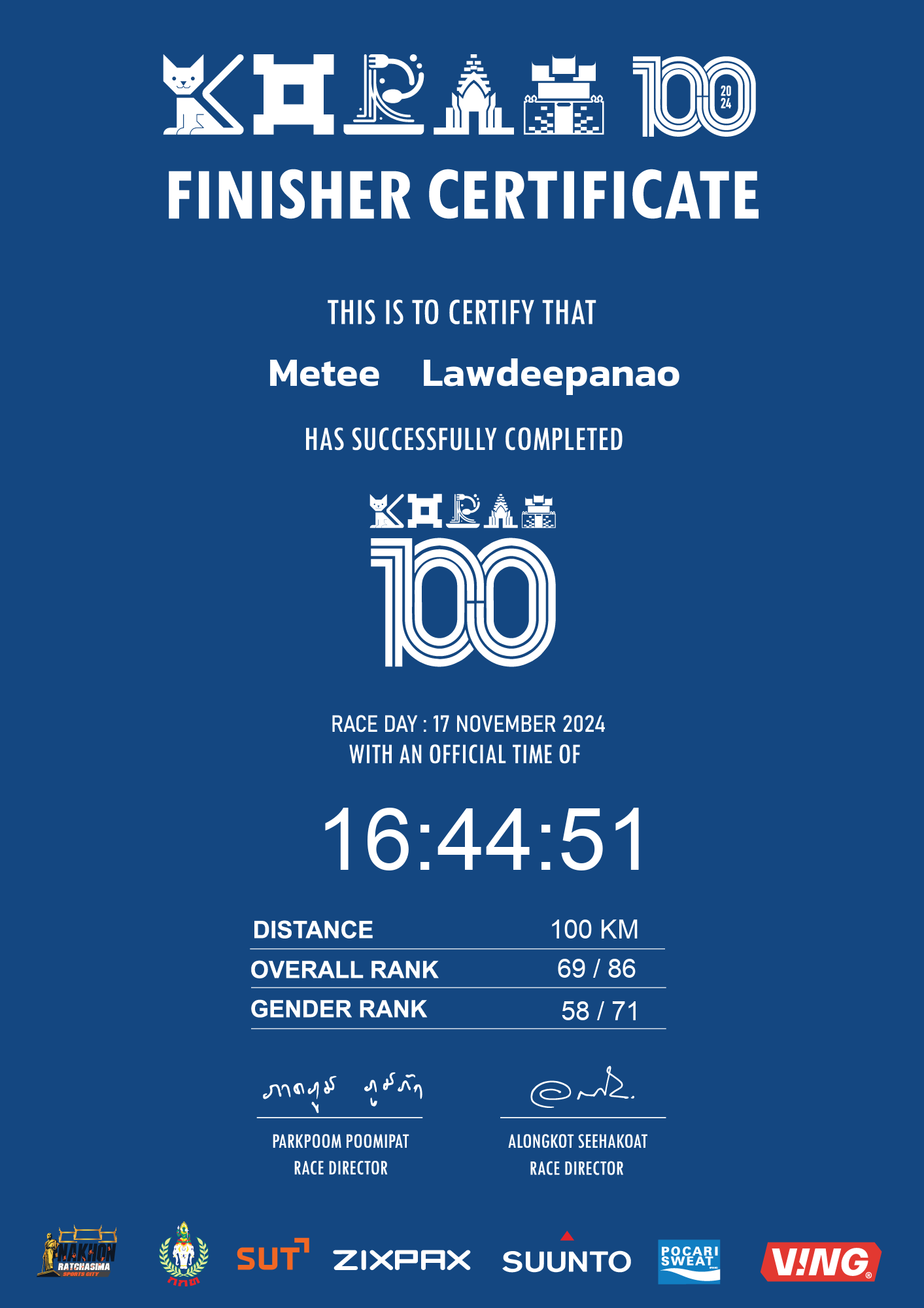 | LAP10 100KM | 100 | 1:40:50 | 16:44:51 | 17 Nov 19:49:51 |