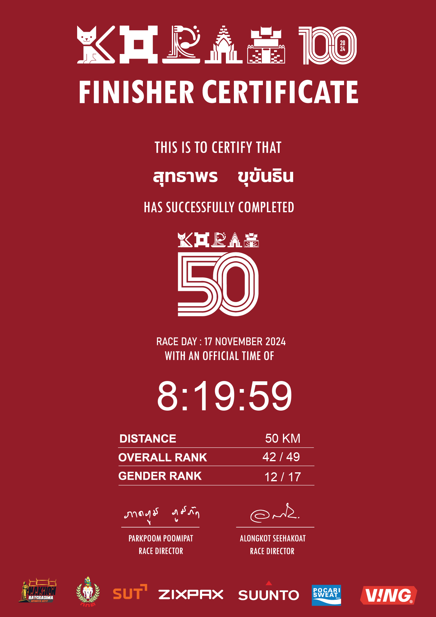 | LAP5 50KM | 50 | 1:36:27 | 8:19:59 | 17 Nov 11:49:59 |