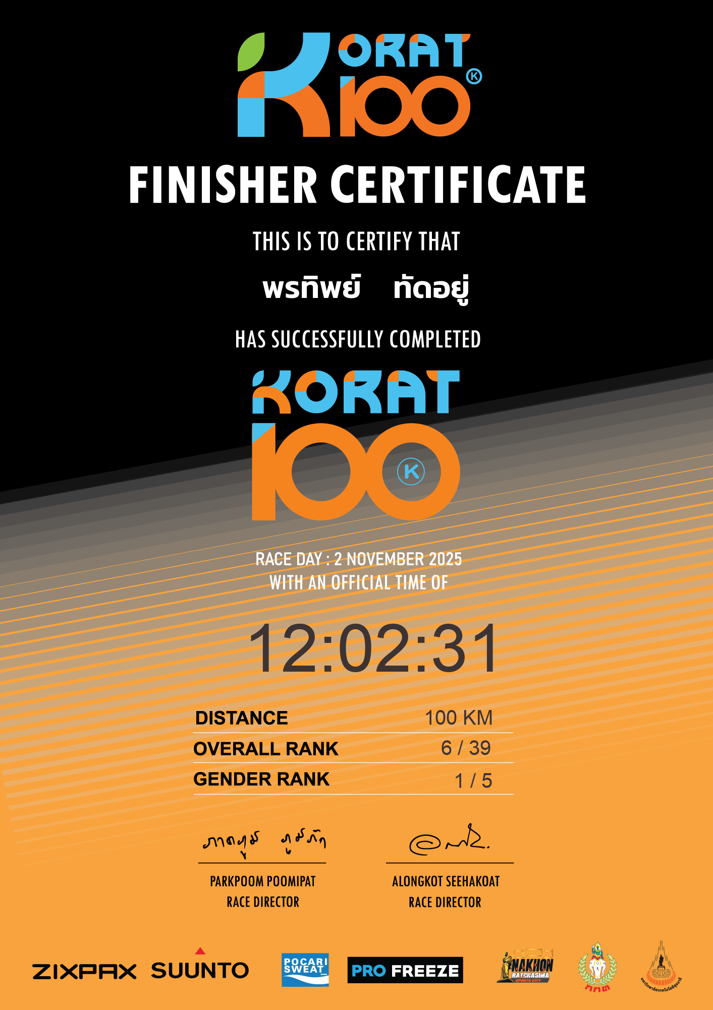 | LAP10 100KM | 100 | 1:33:22 | 12:02:31 | 2 Nov 15:02:31 |
