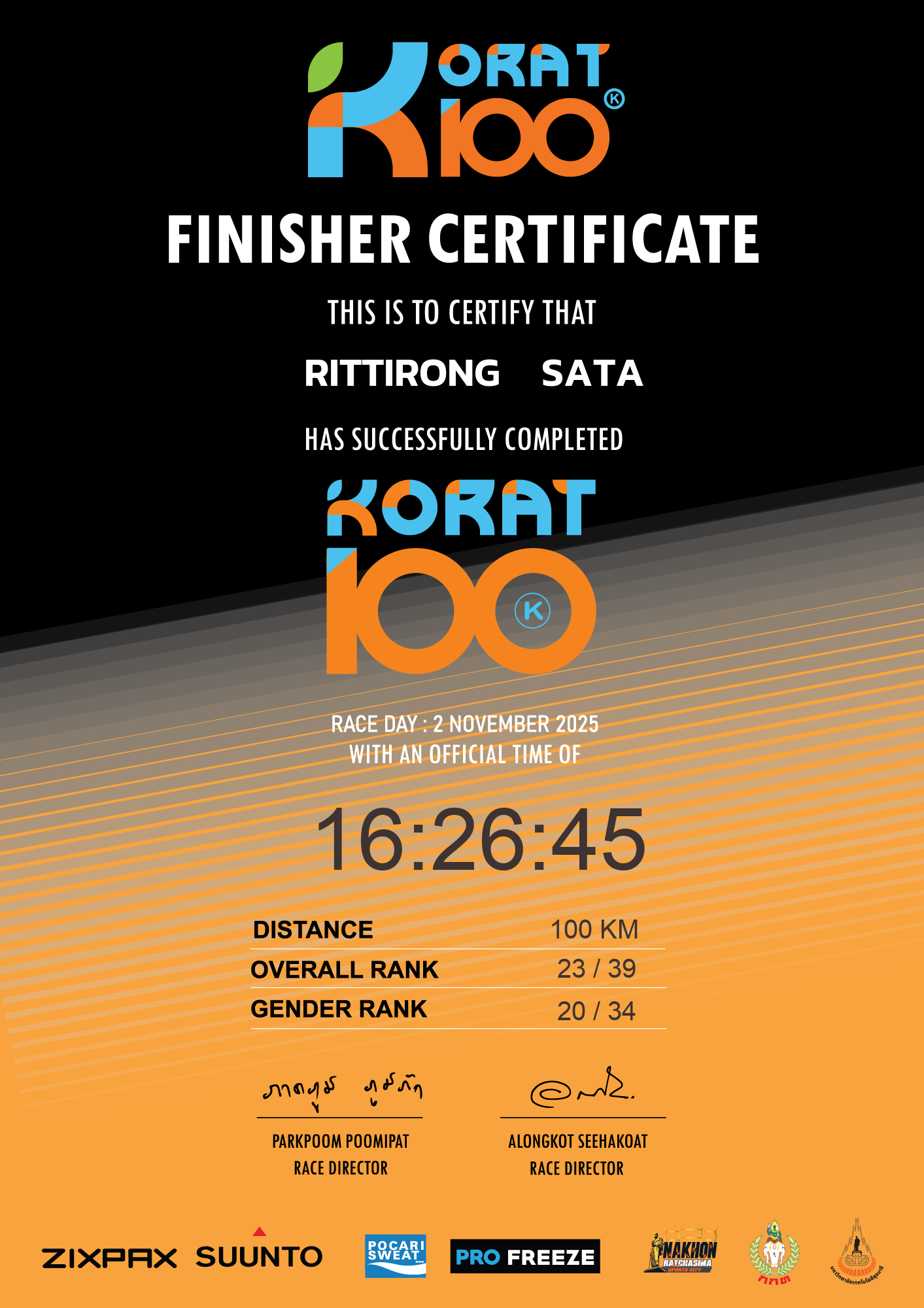 | LAP5 50KM | 50 | 1:35:48 | 6:27:24 | 2 Nov 09:27:24 |