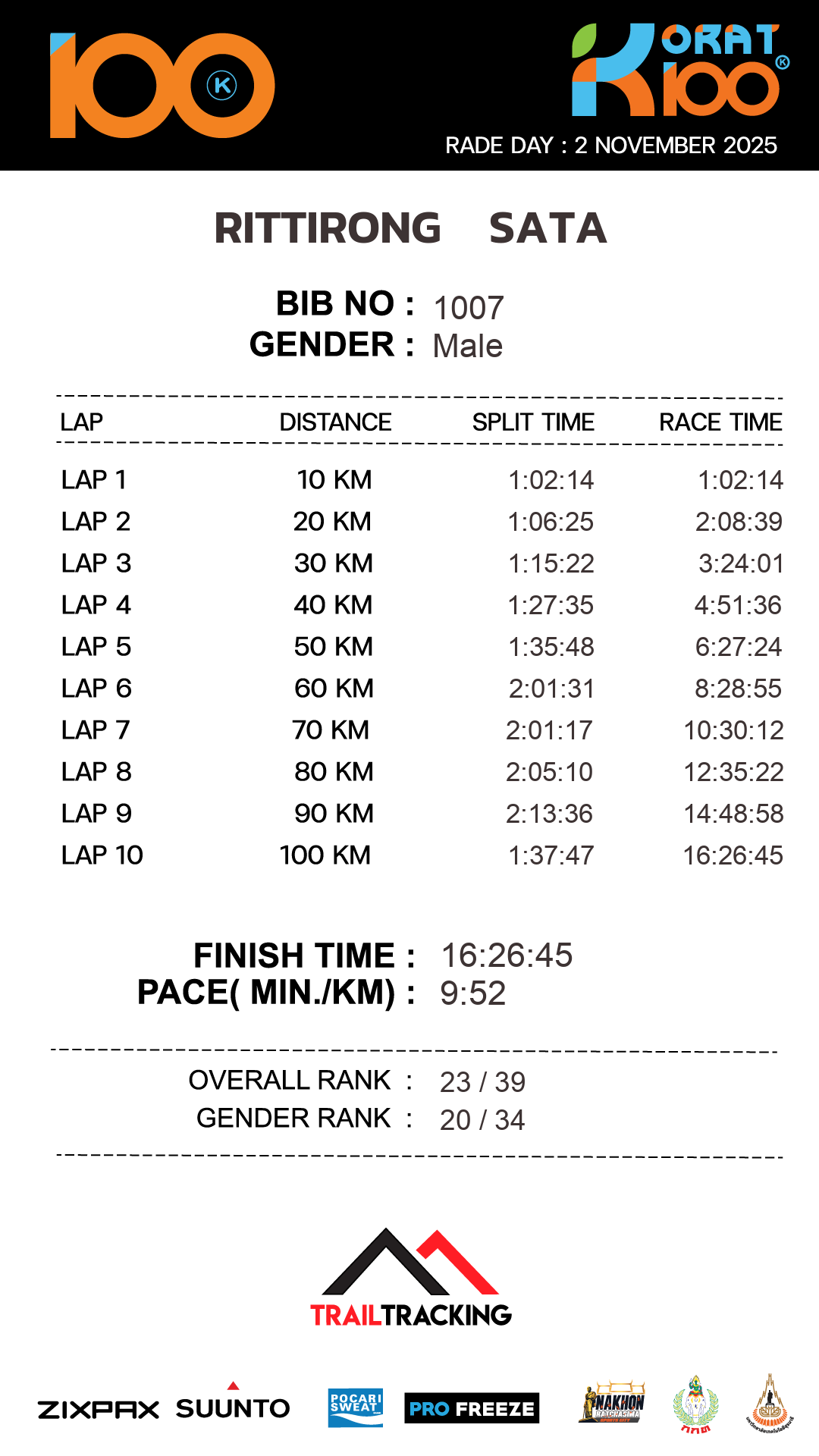 | LAP10 100KM | 100 | 1:37:47 | 16:26:45 | 2 Nov 19:26:45 |