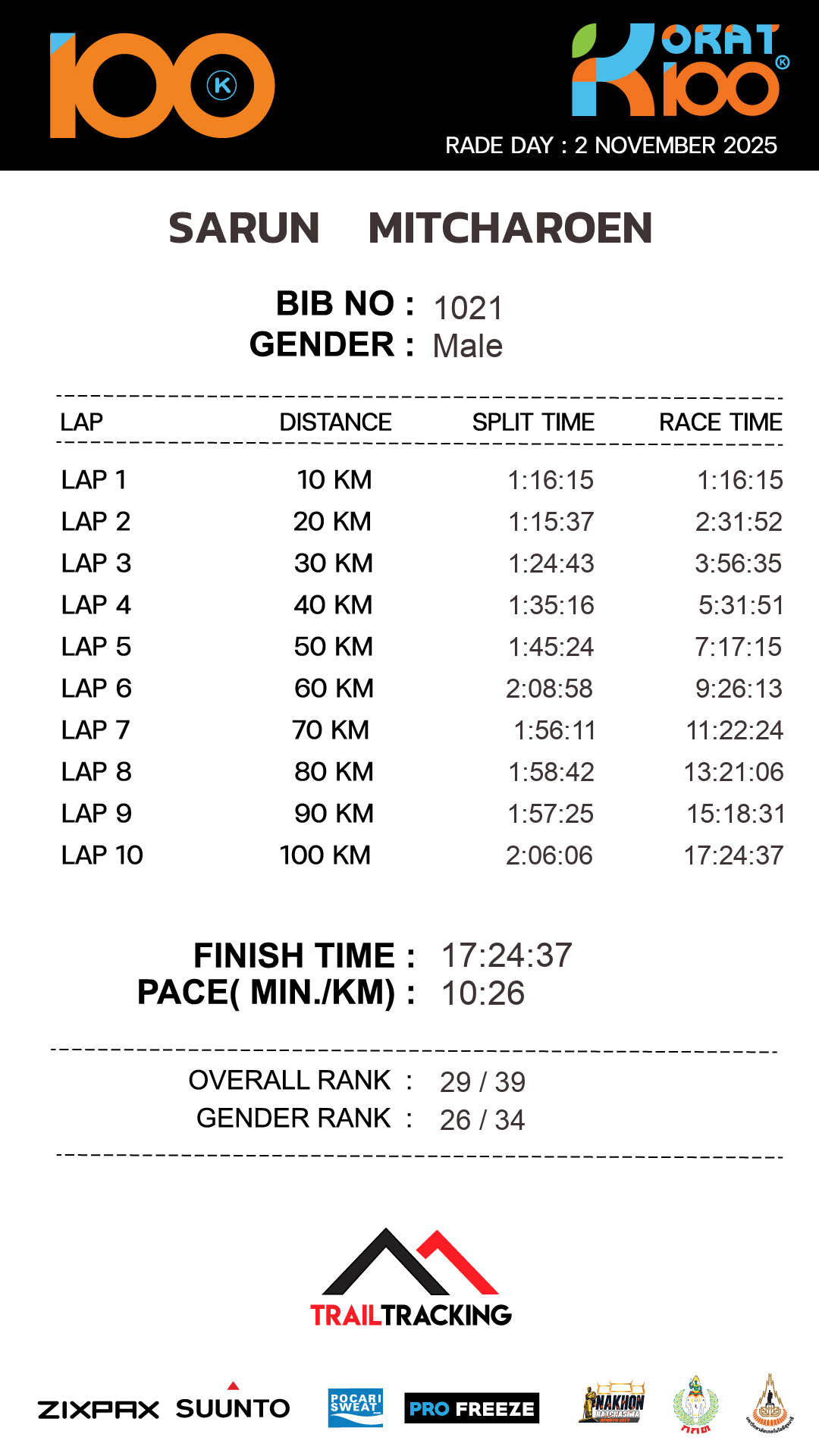 | LAP10 100KM | 100 | 2:06:06 | 17:24:37 | 2 Nov 20:24:37 |