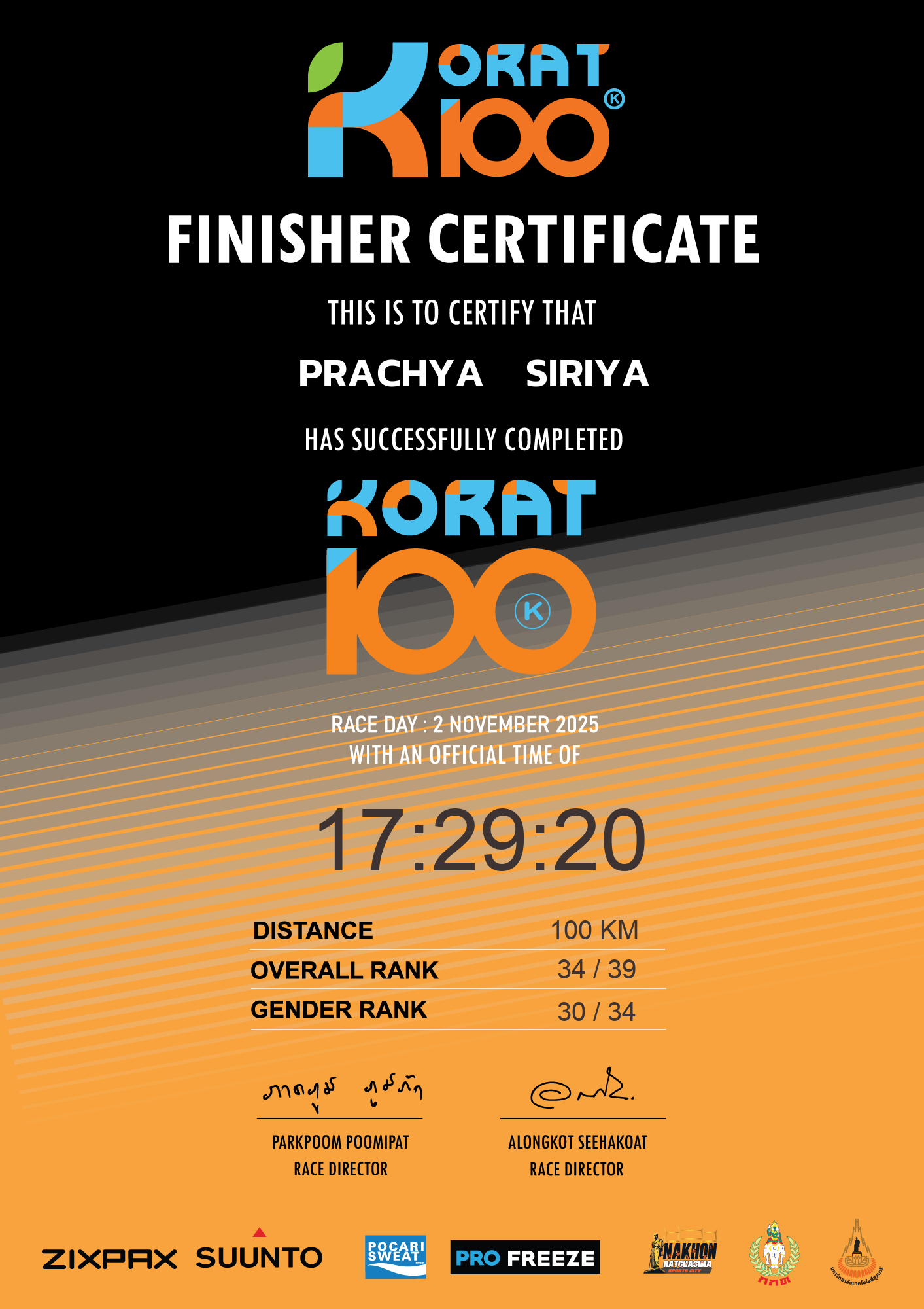 | LAP4 40KM | 40 | 1:41:07 | 5:27:06 | 2 Nov 08:27:06 |