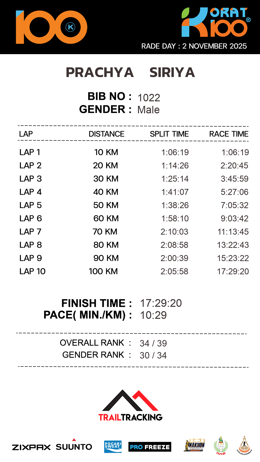 | LAP10 100KM | 100 | 2:05:58 | 17:29:20 | 2 Nov 20:29:20 |