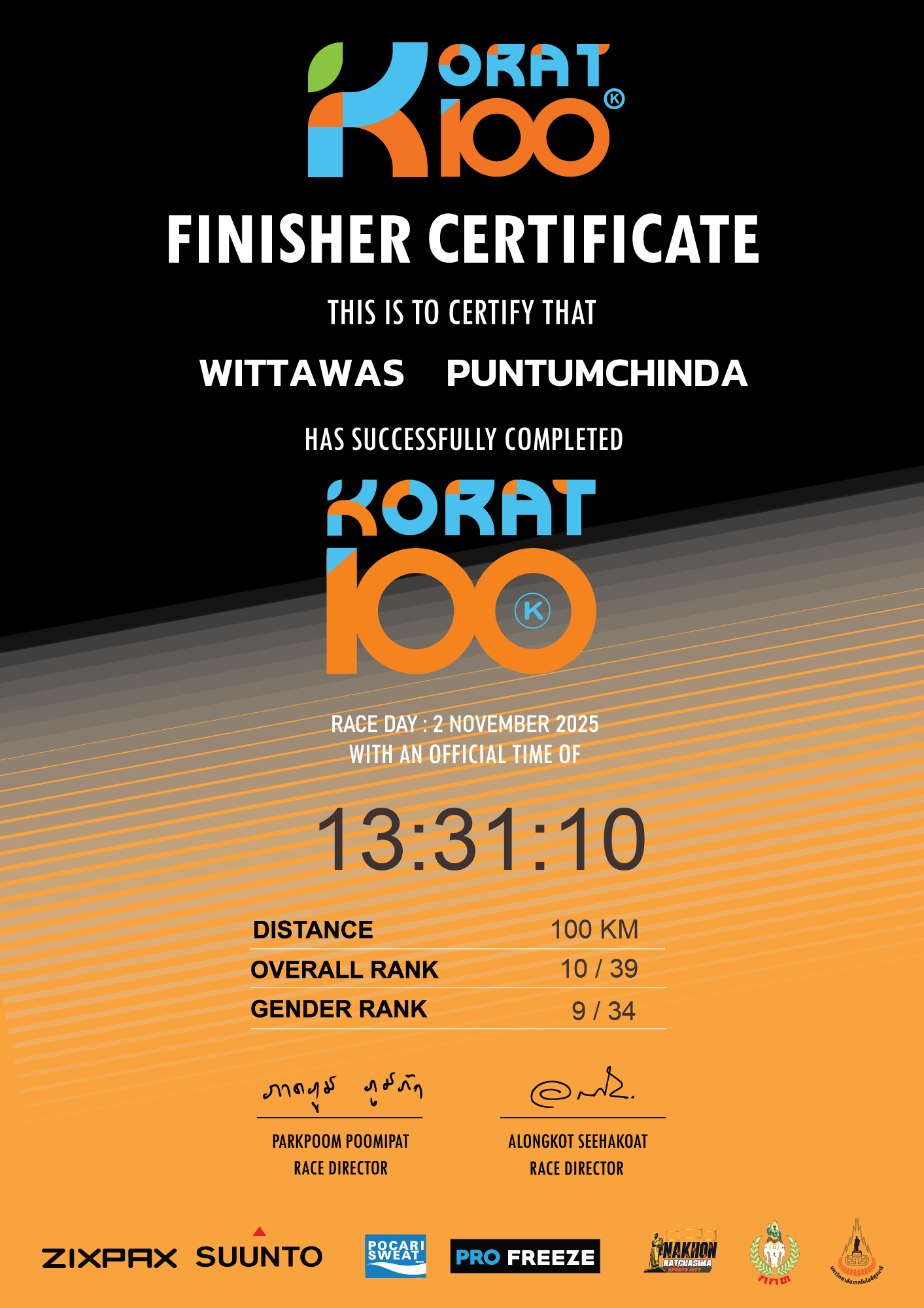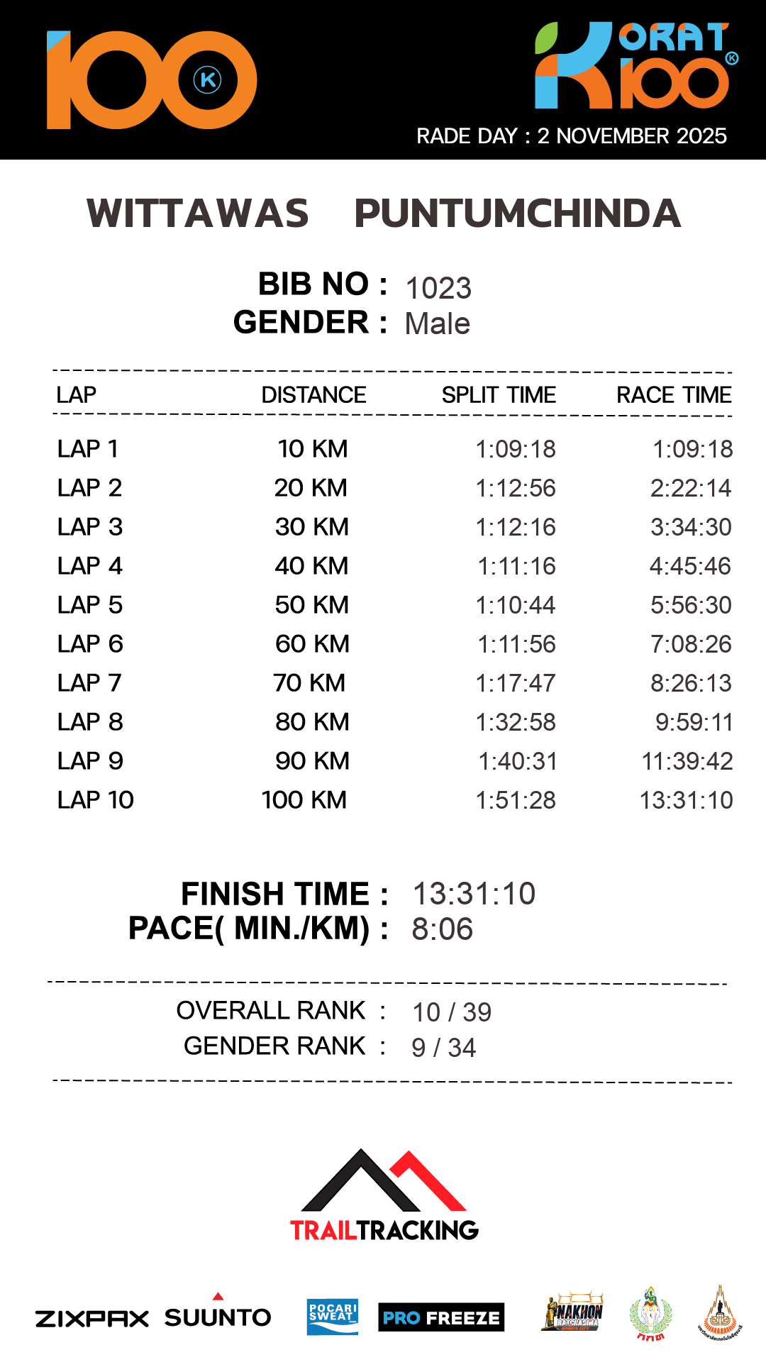 | LAP10 100KM | 100 | 1:51:28 | 13:31:10 | 2 Nov 16:31:10 |