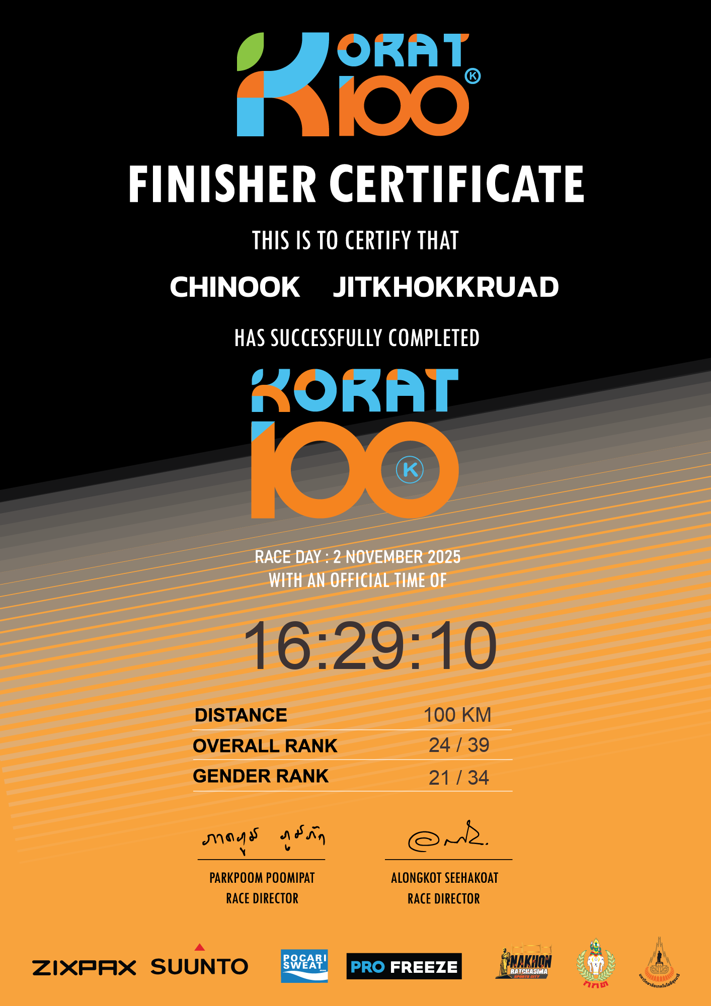 | LAP2 20KM | 20 | 1:16:05 | 2:25:58 | 2 Nov 05:25:58 |