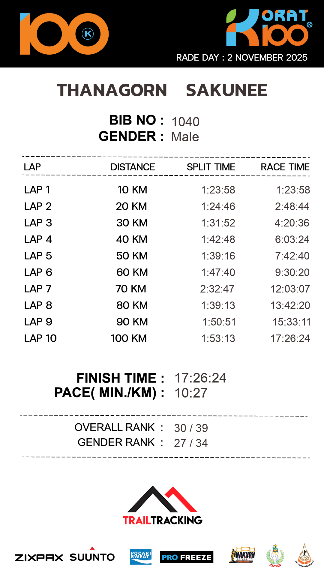 | LAP4 40KM | 40 | 1:42:48 | 6:03:24 | 2 Nov 09:03:24 |