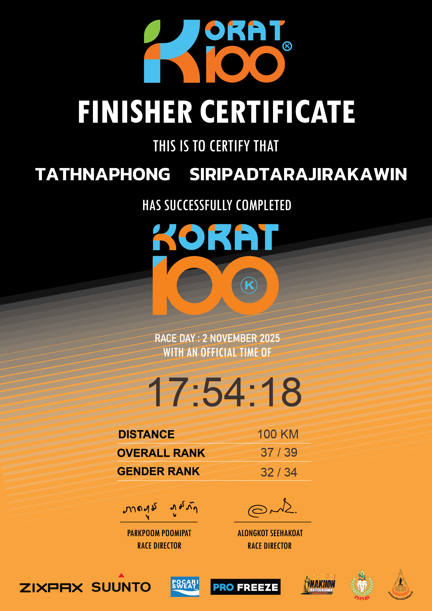 | LAP5 50KM | 50 | 1:56:38 | 8:30:29 | 2 Nov 11:30:29 |