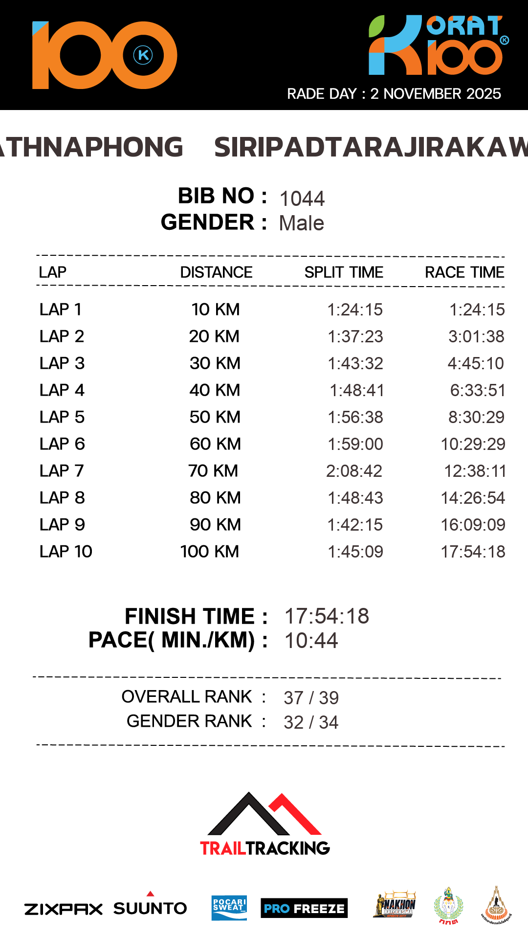 | LAP10 100KM | 100 | 1:45:09 | 17:54:18 | 2 Nov 20:54:18 |
