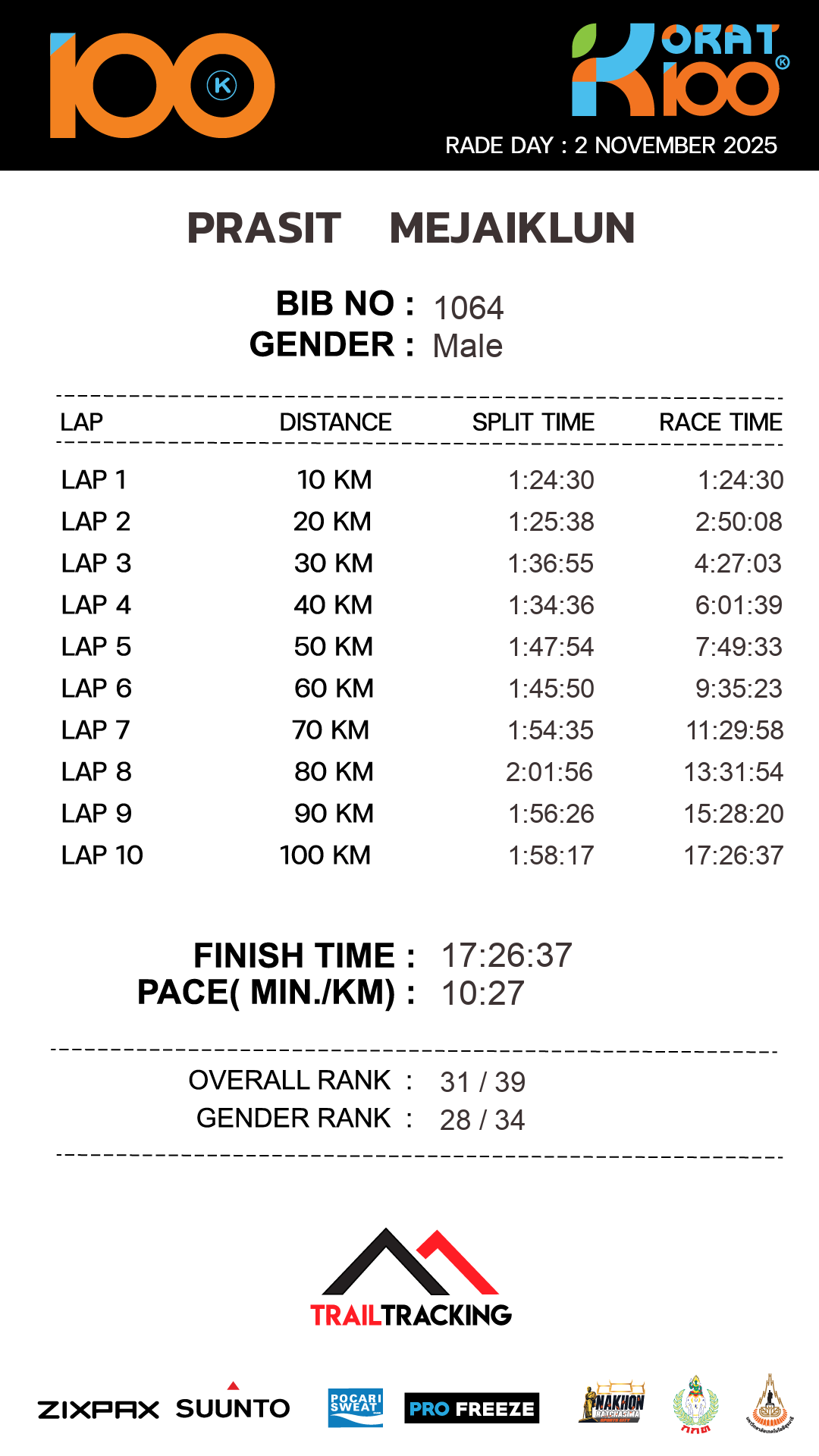 | LAP10 100KM | 100 | 1:58:17 | 17:26:37 | 2 Nov 20:26:37 |