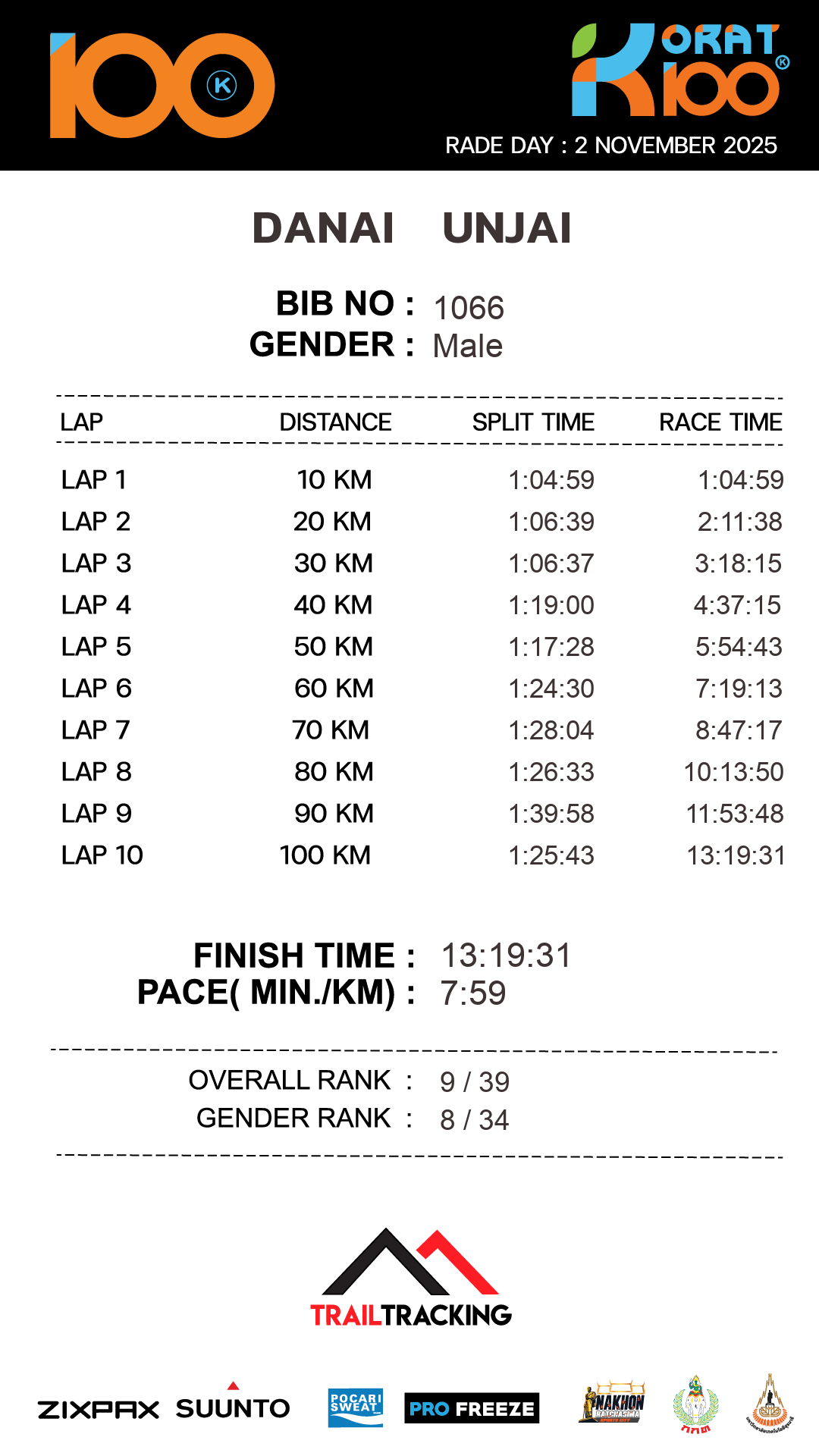 | LAP6 60KM | 60 | 1:24:30 | 7:19:13 | 2 Nov 10:19:13 |