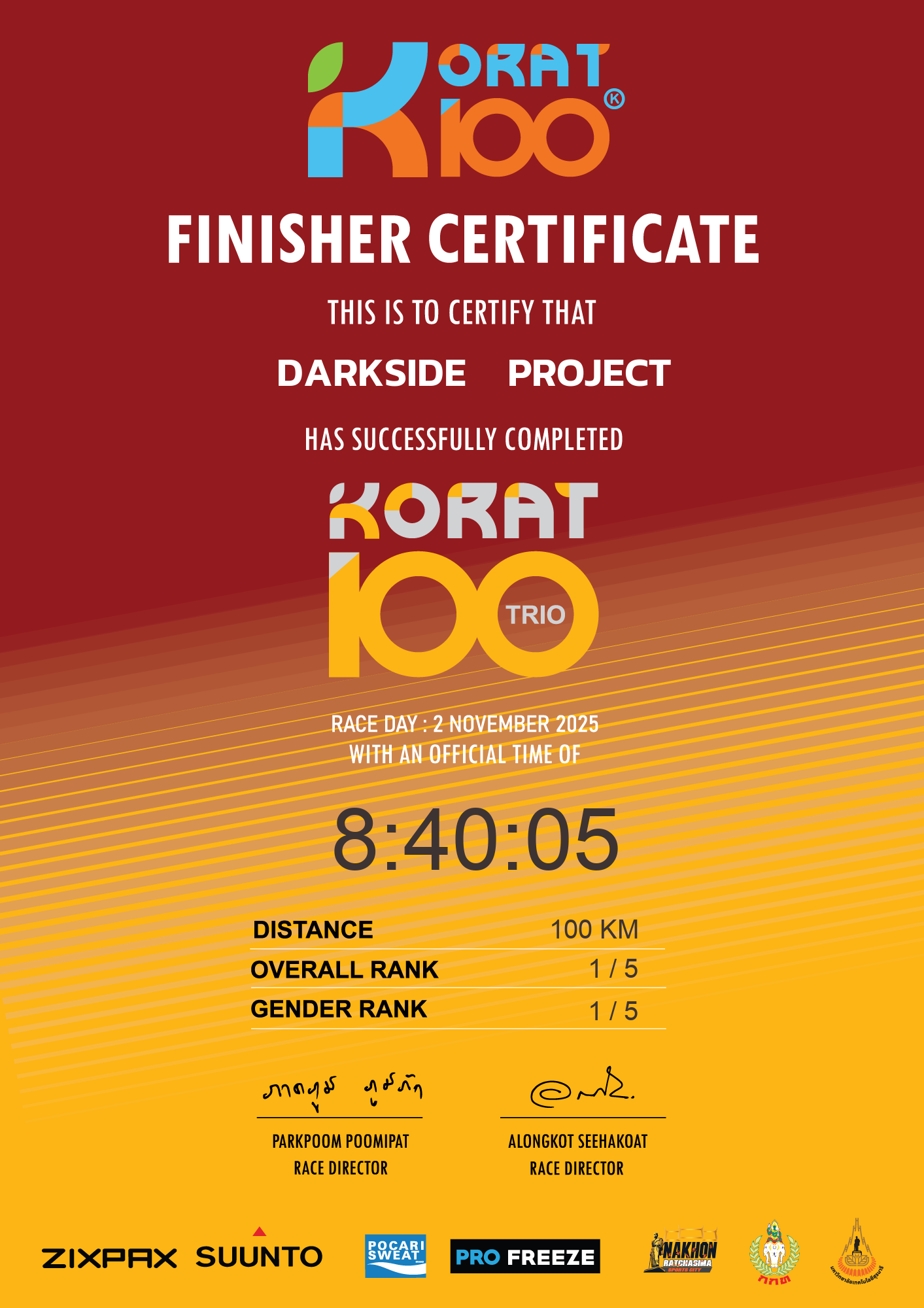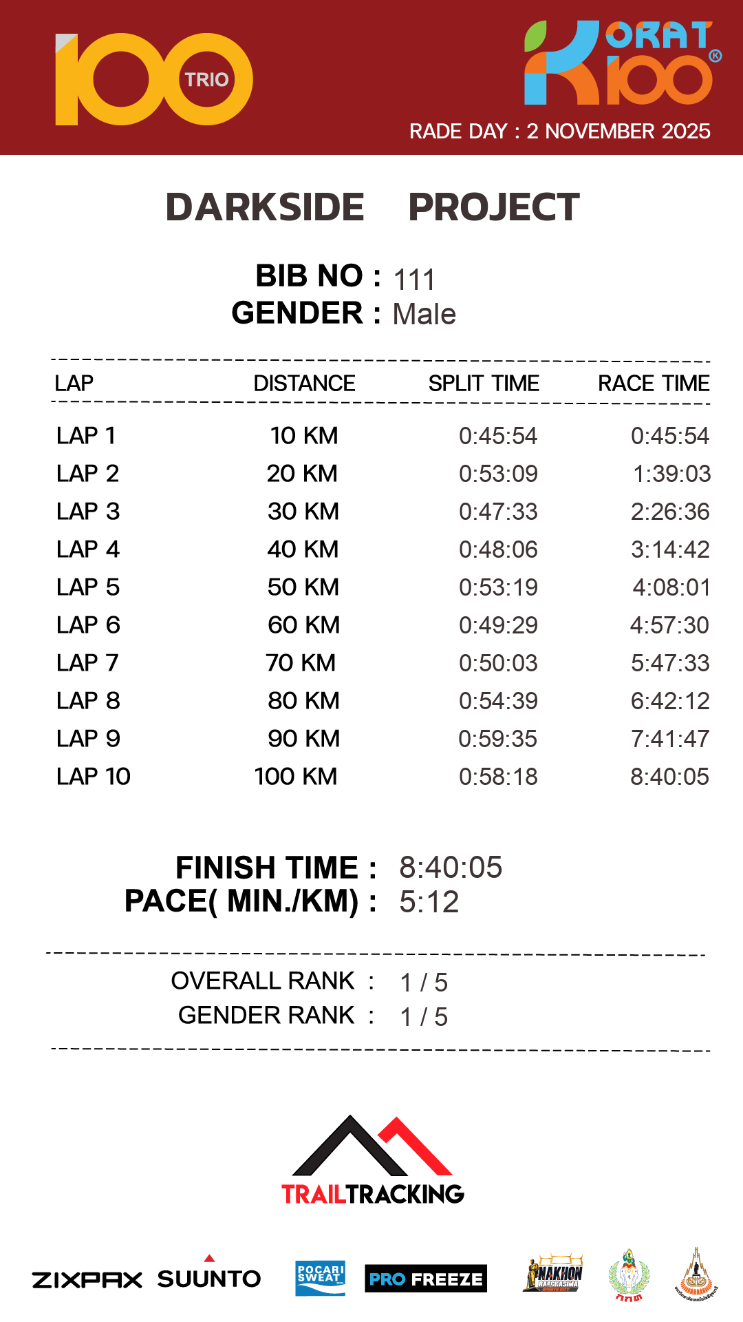 | LAP10 100KM | 100 | 0:58:18 | 8:40:05 | 2 Nov 12:10:05 |