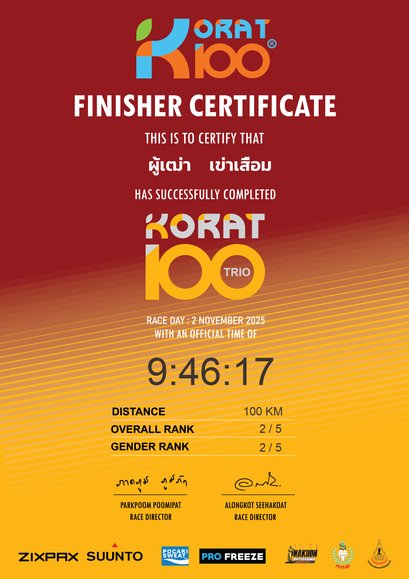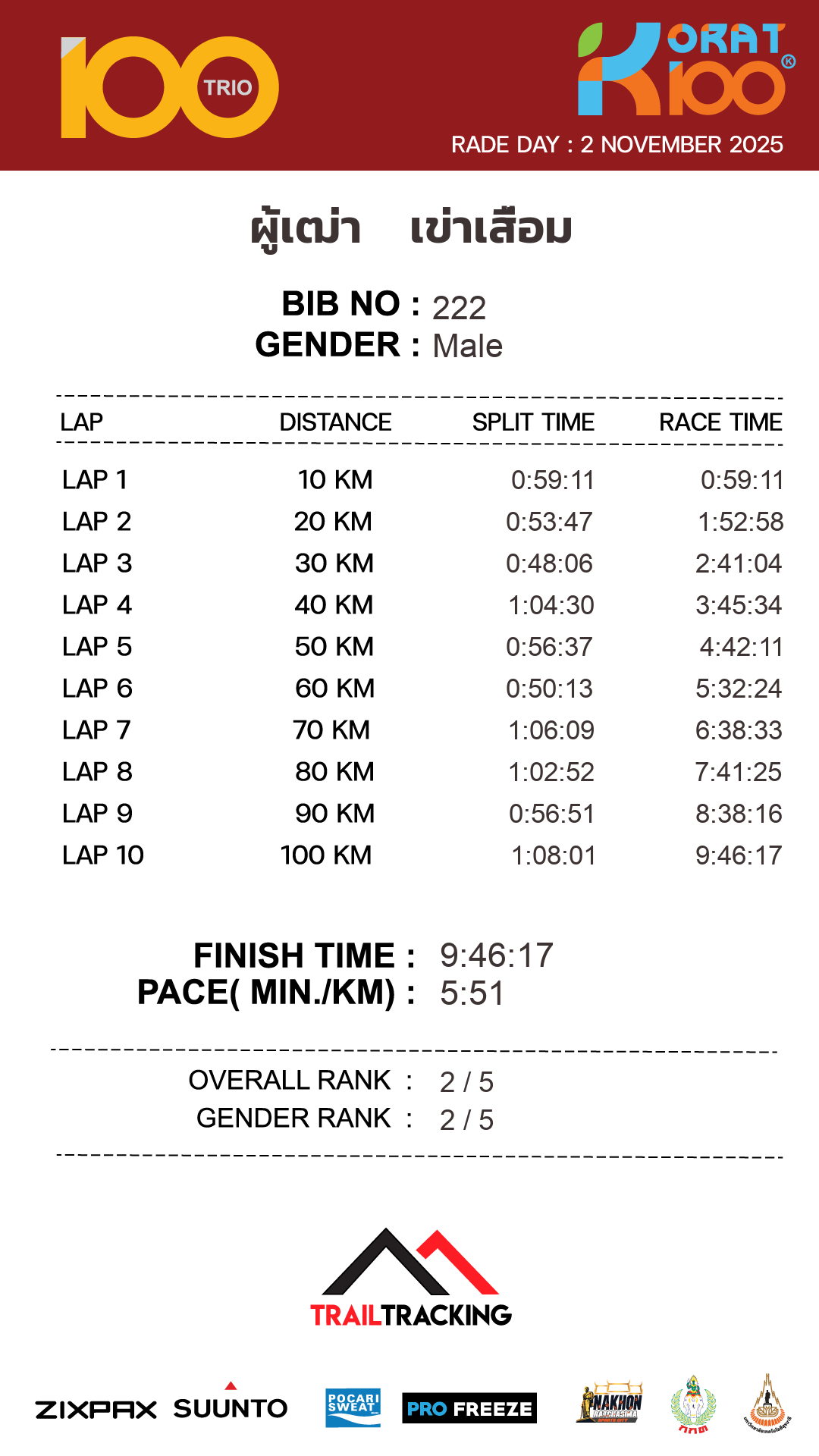 | LAP10 100KM | 100 | 1:08:01 | 9:46:17 | 2 Nov 13:16:17 |
