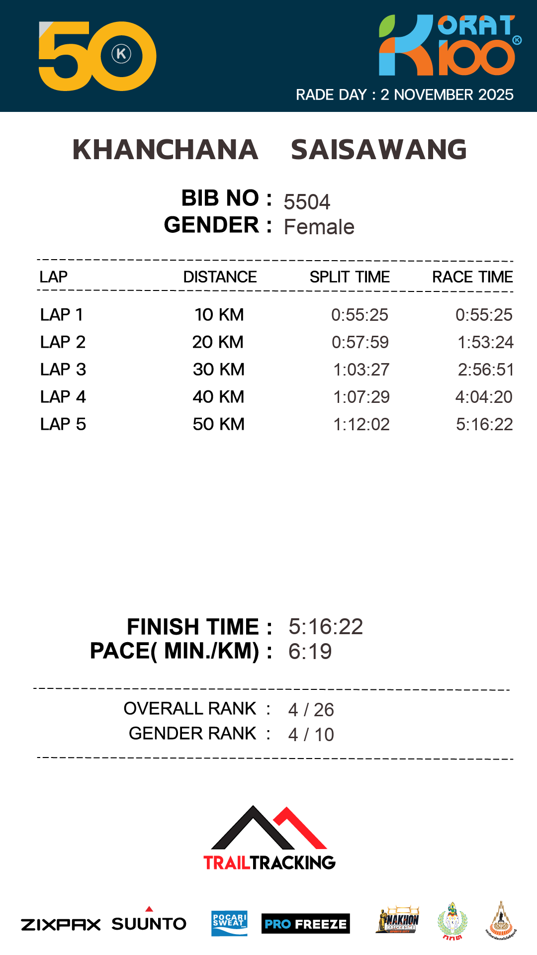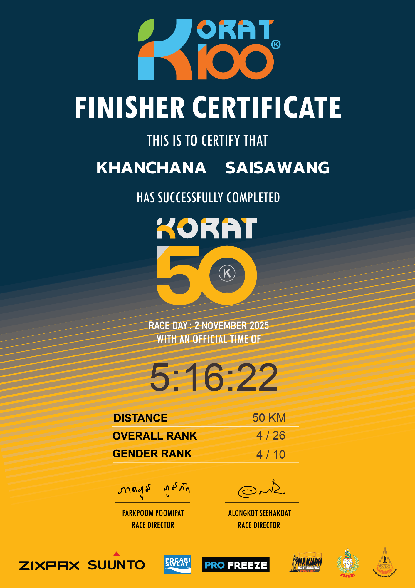 | LAP5 50KM | 50 | 1:12:02 | 5:16:22 | 2 Nov 09:16:22 |