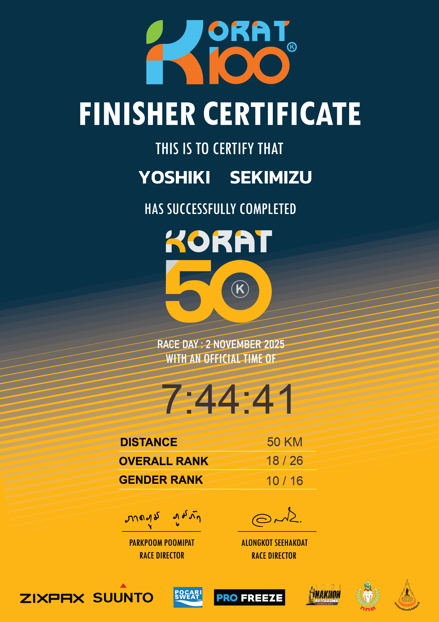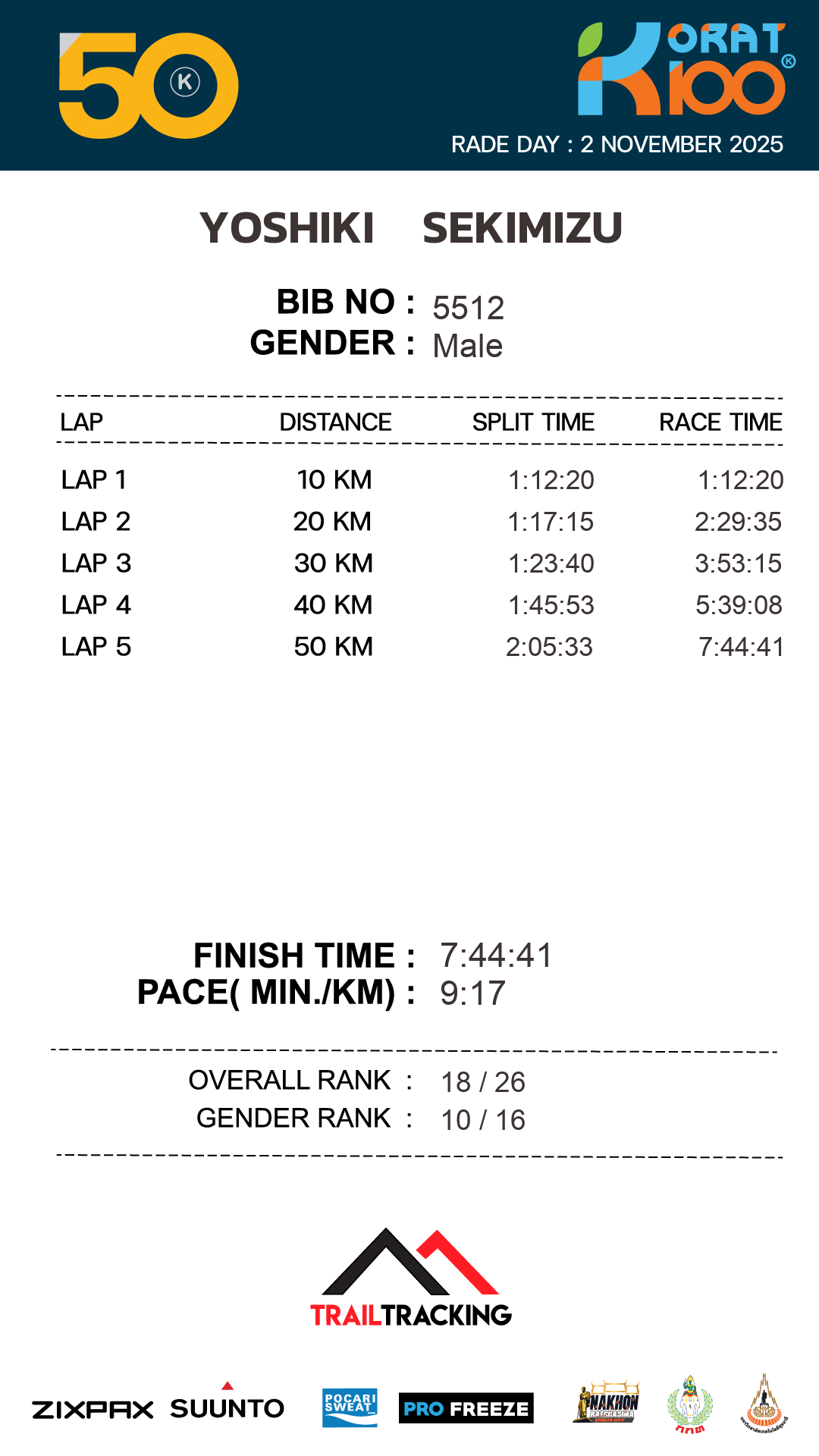| LAP5 50KM | 50 | 2:05:33 | 7:44:41 | 2 Nov 11:44:41 |