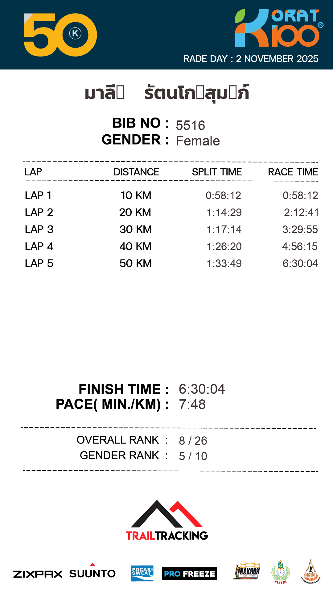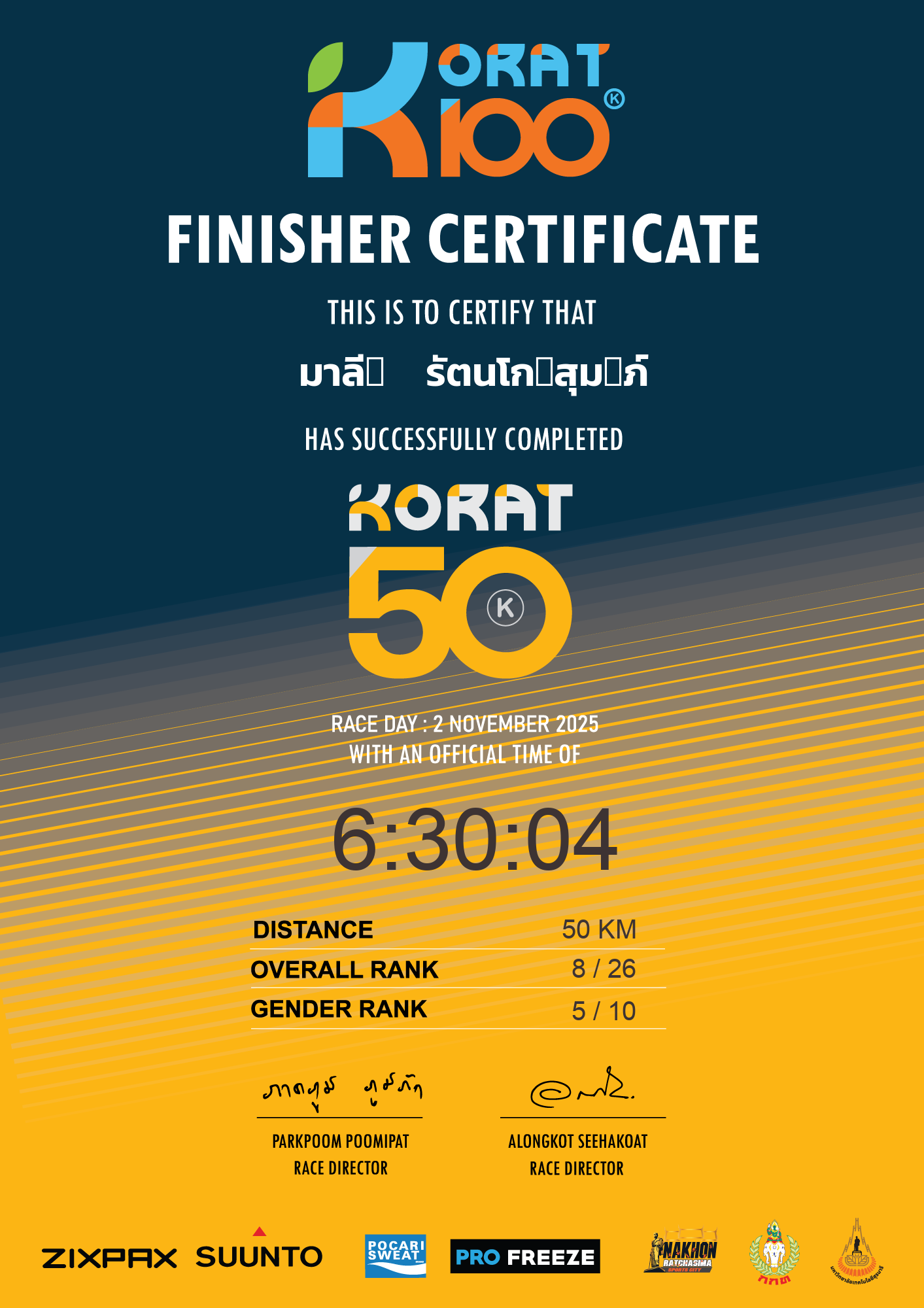 | LAP5 50KM | 50 | 1:33:49 | 6:30:04 | 2 Nov 10:30:04 |