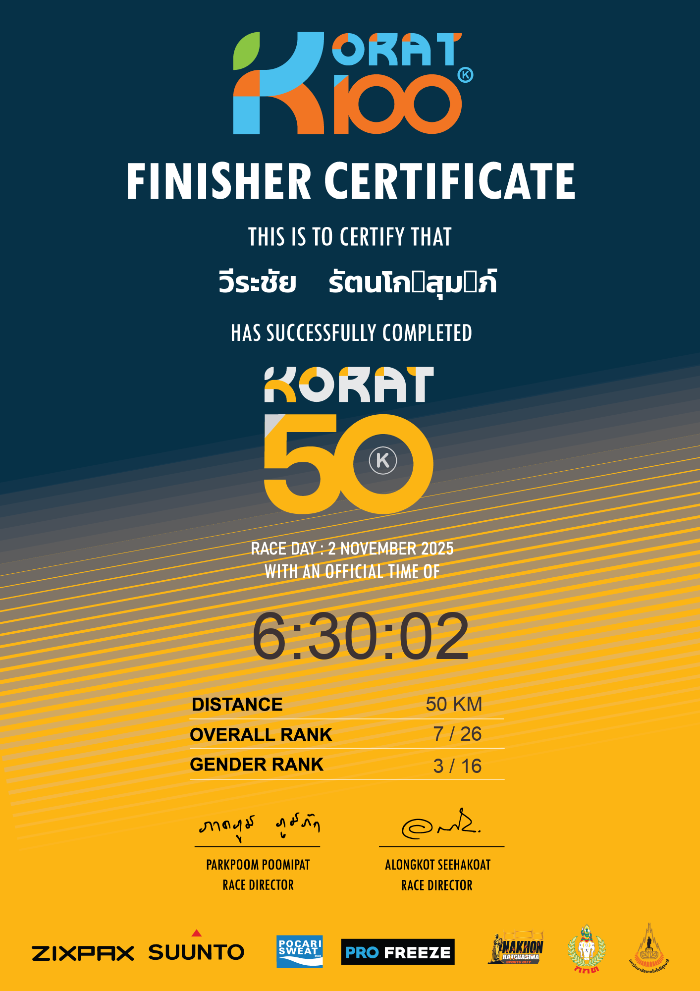 | LAP5 50KM | 50 | 1:31:07 | 6:30:02 | 2 Nov 10:30:02 |