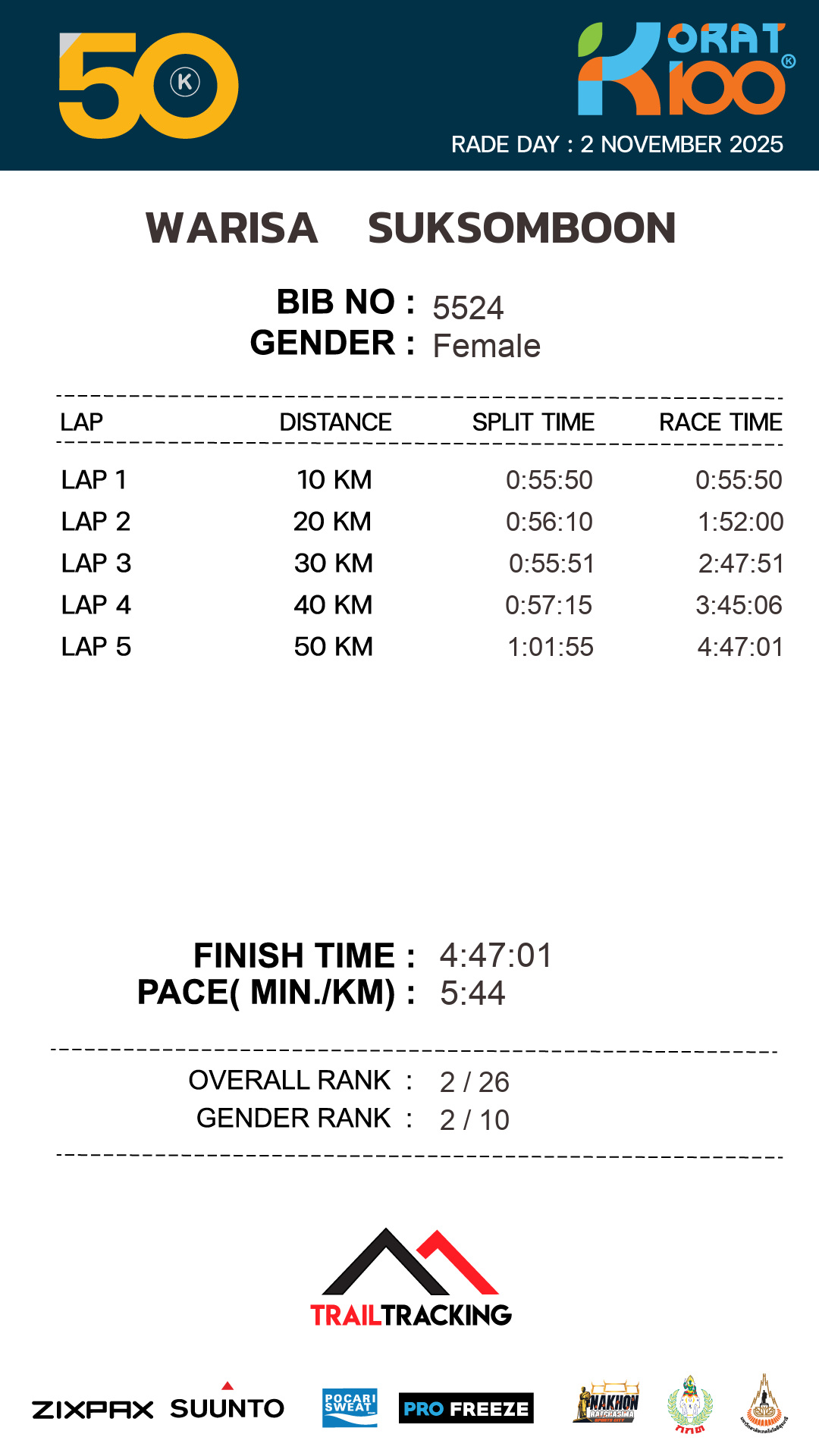 | LAP5 50KM | 50 | 1:01:55 | 4:47:01 | 2 Nov 08:47:01 |