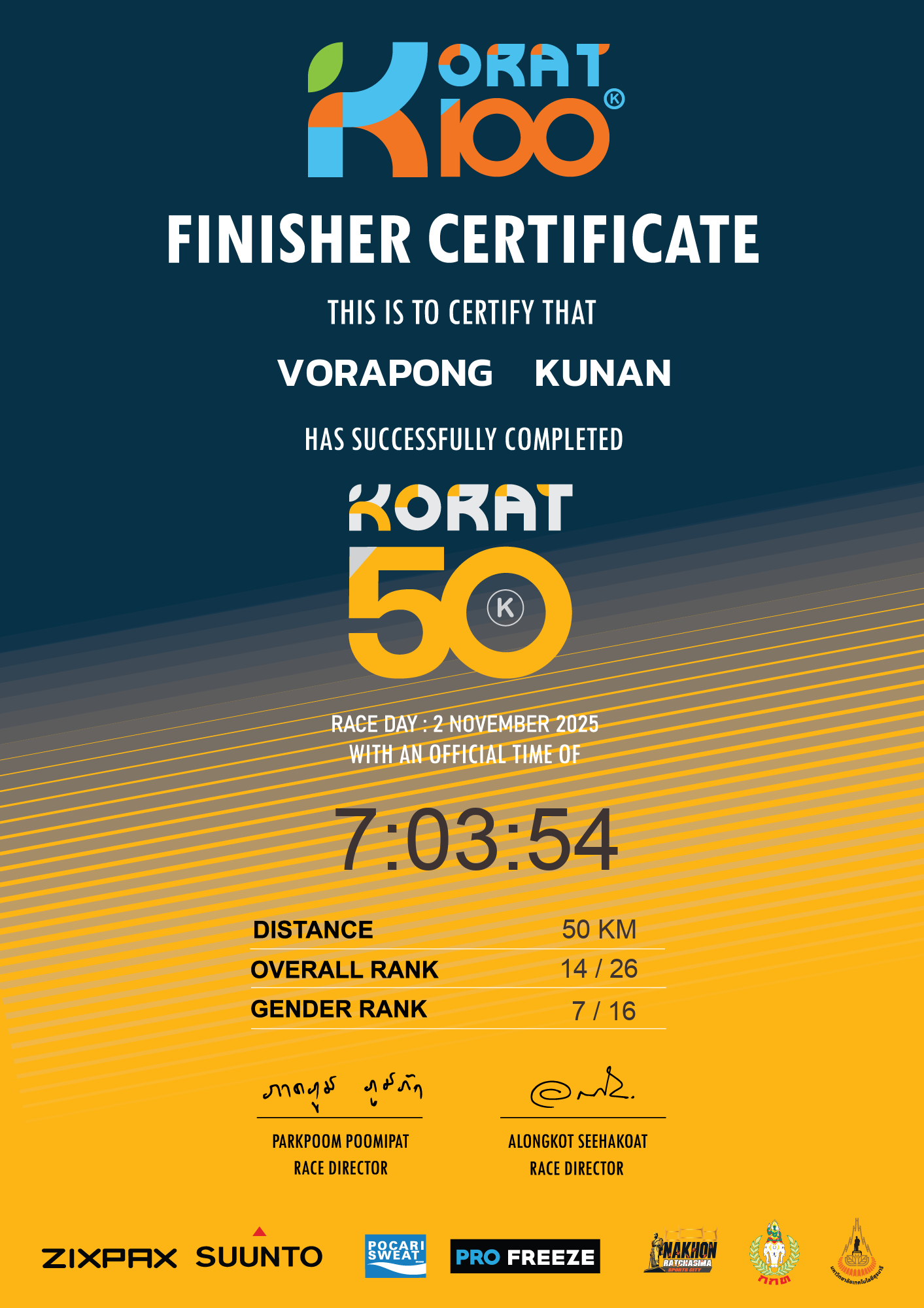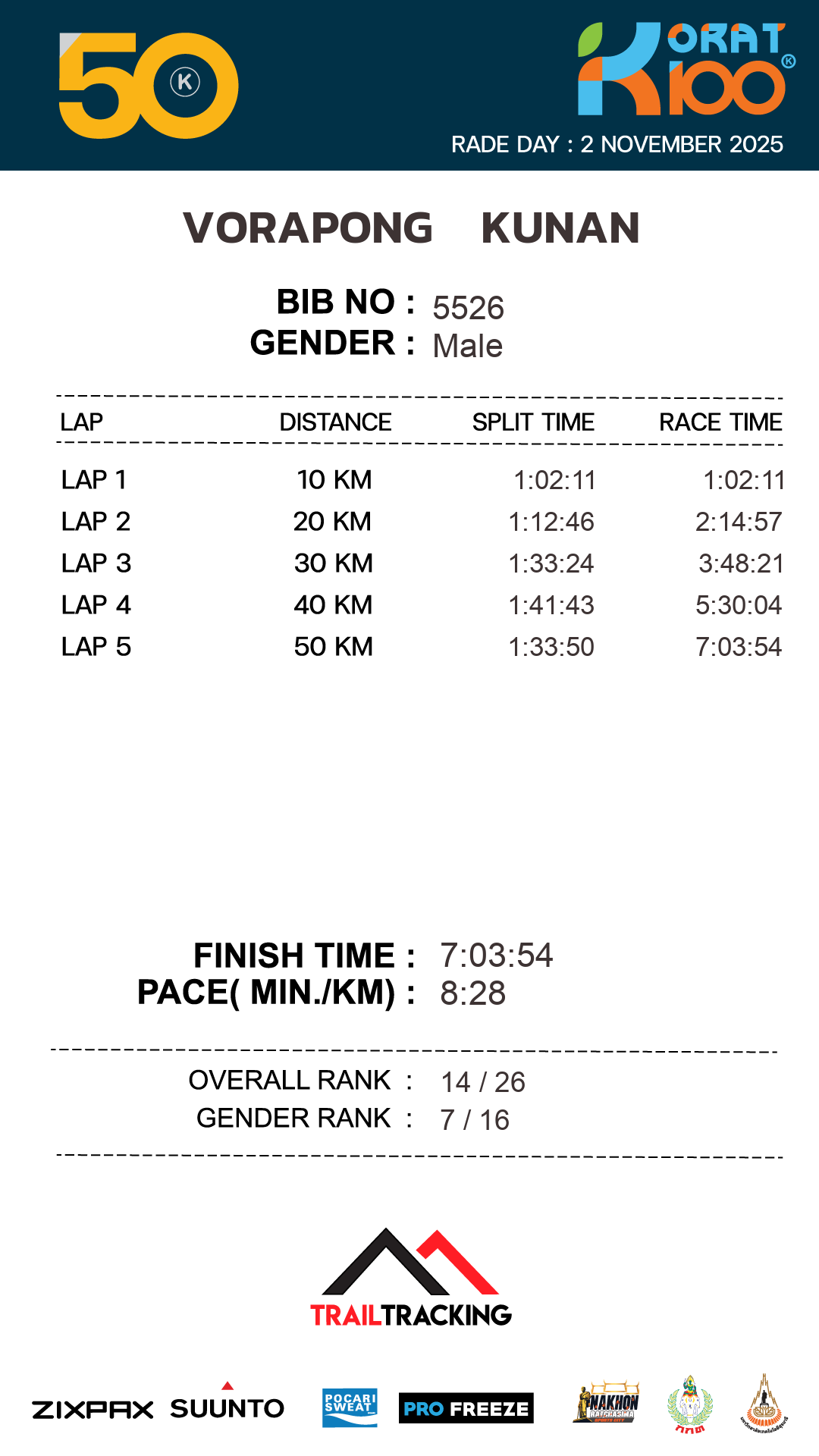 | LAP5 50KM | 50 | 1:33:50 | 7:03:54 | 2 Nov 11:03:54 |