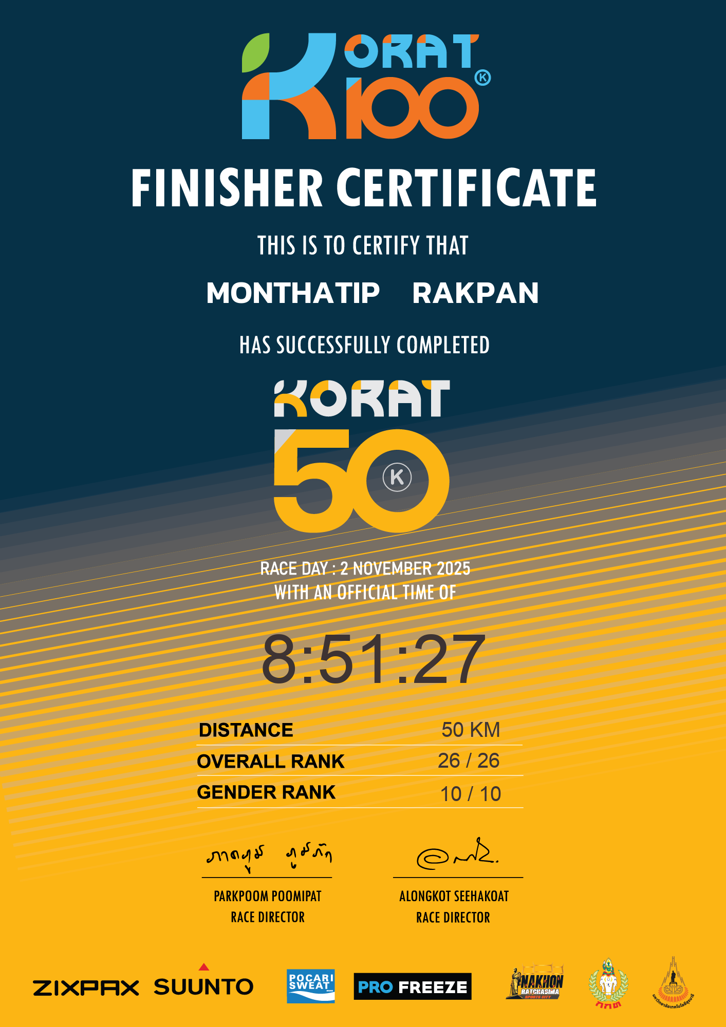 | LAP5 50KM | 50 | 1:47:24 | 8:51:27 | 2 Nov 12:51:27 |