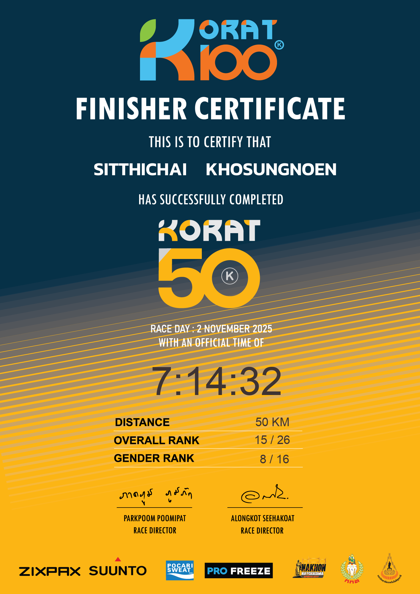 | LAP5 50KM | 50 | 1:47:26 | 7:14:32 | 2 Nov 11:14:32 |