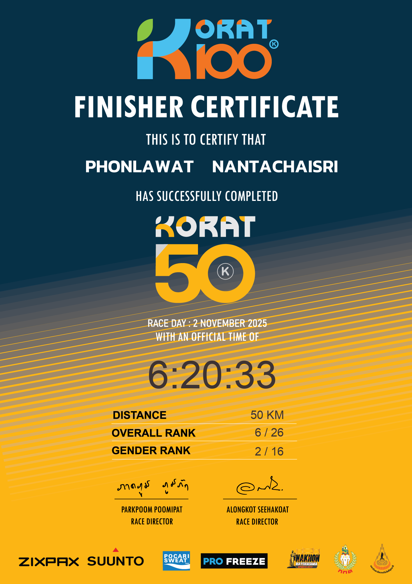 | LAP5 50KM | 50 | 1:29:22 | 6:20:33 | 2 Nov 10:20:33 |