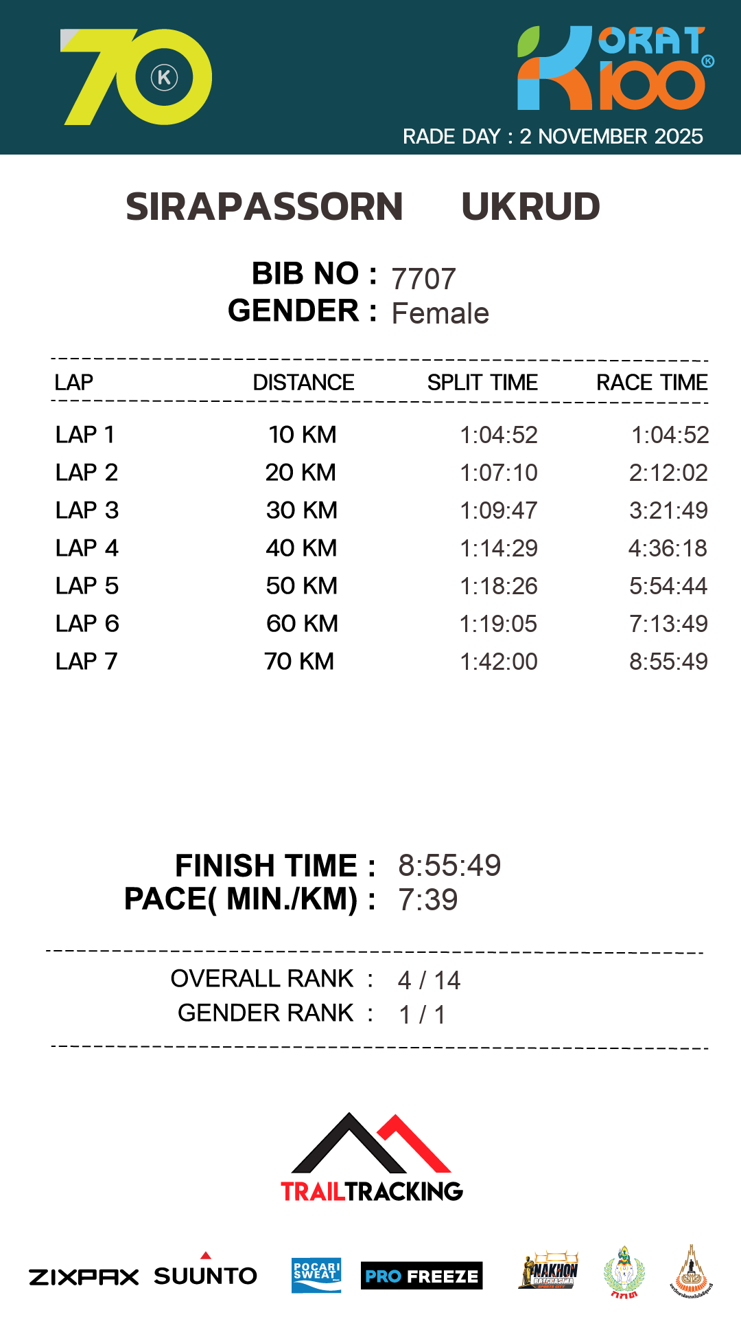 | LAP7 70KM | 70 | 1:42:00 | 8:55:49 | 2 Nov 12:25:49 |