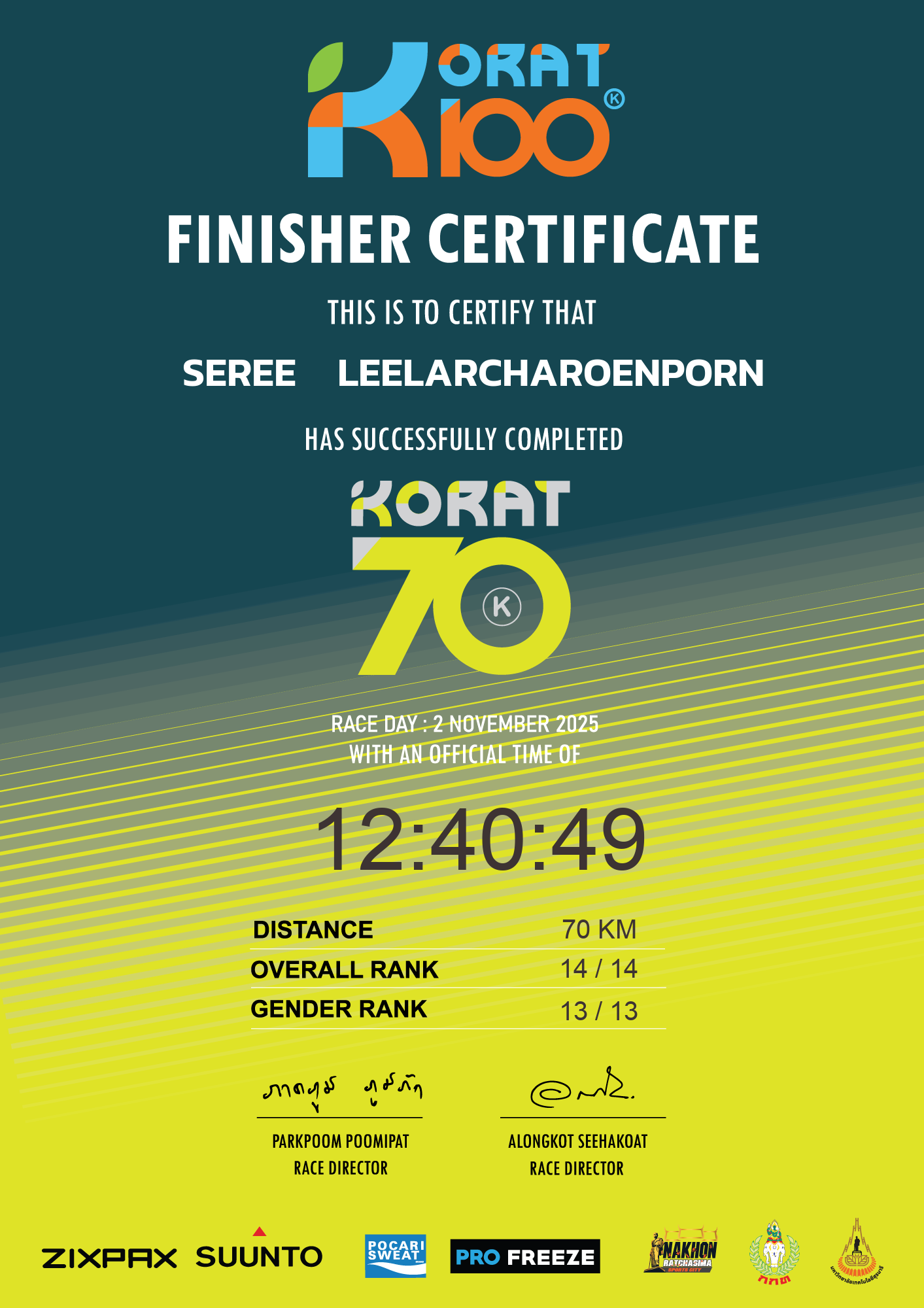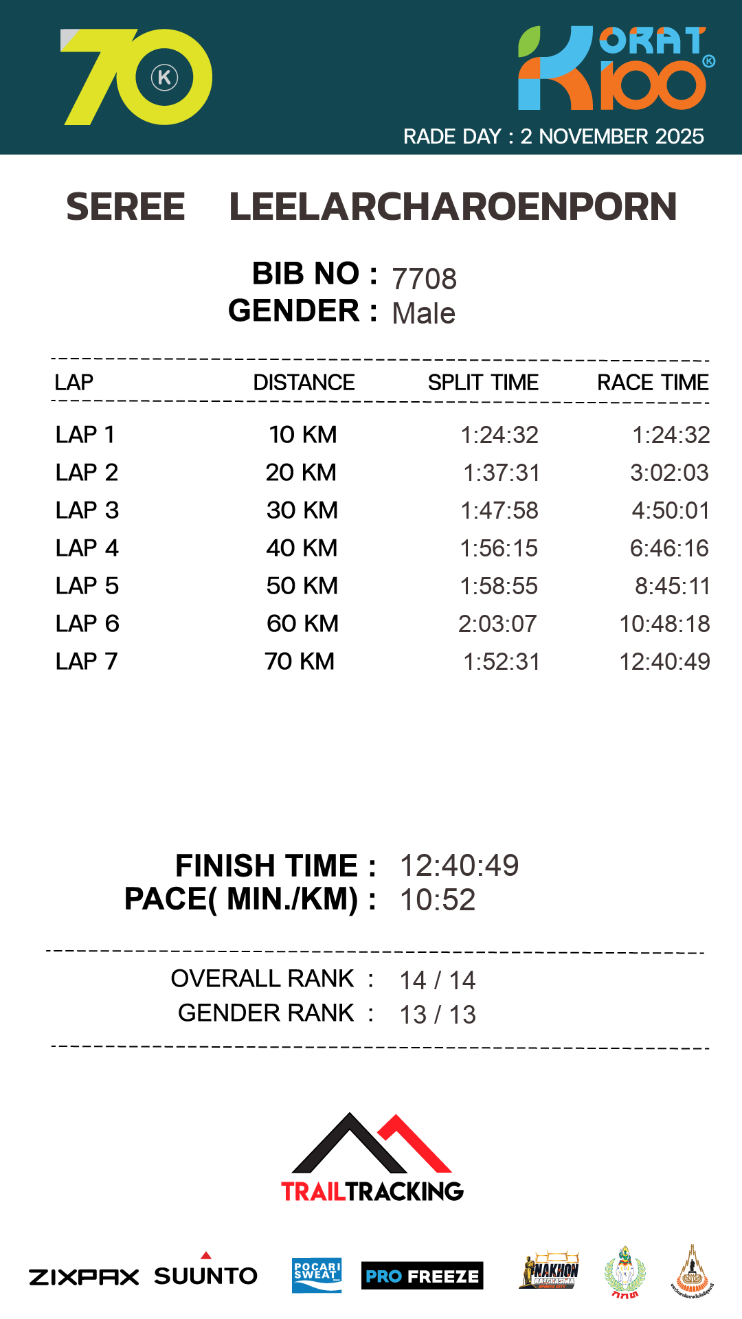 | LAP4 40KM | 40 | 1:56:15 | 6:46:16 | 2 Nov 10:16:16 |