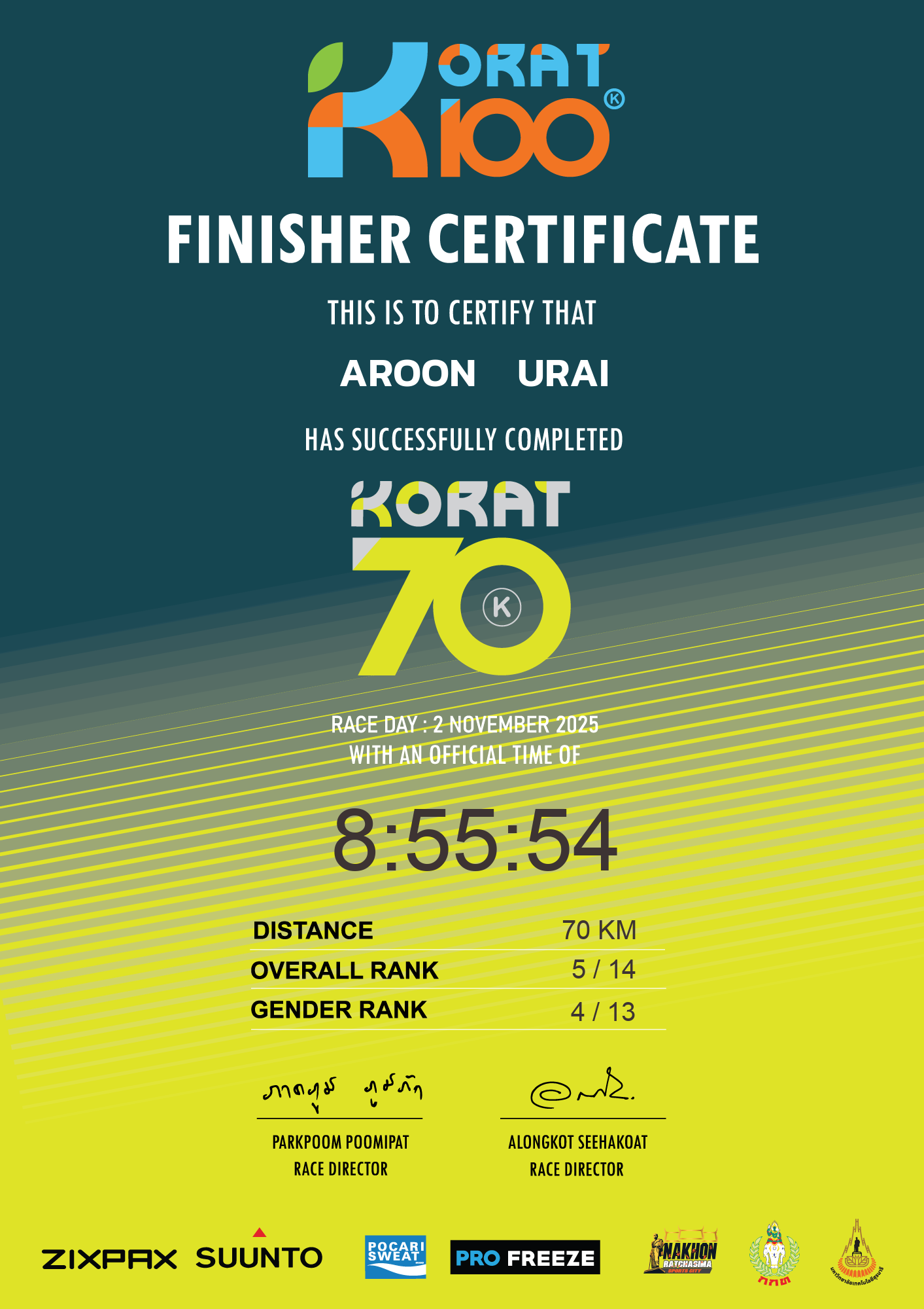 | LAP2 20KM | 20 | 1:08:10 | 2:12:59 | 2 Nov 05:42:59 |