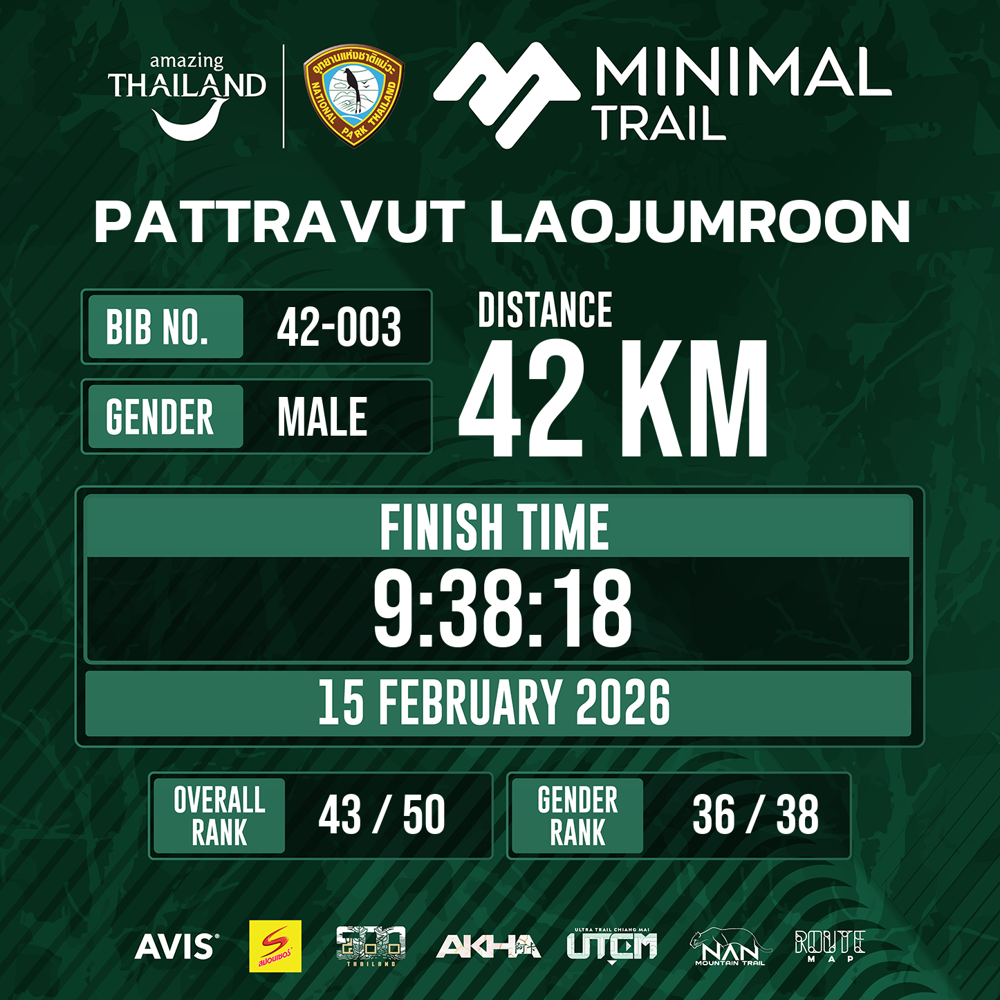 42 | 3:40:13 | 9:38:18 | 15 Feb 16:12:18 |