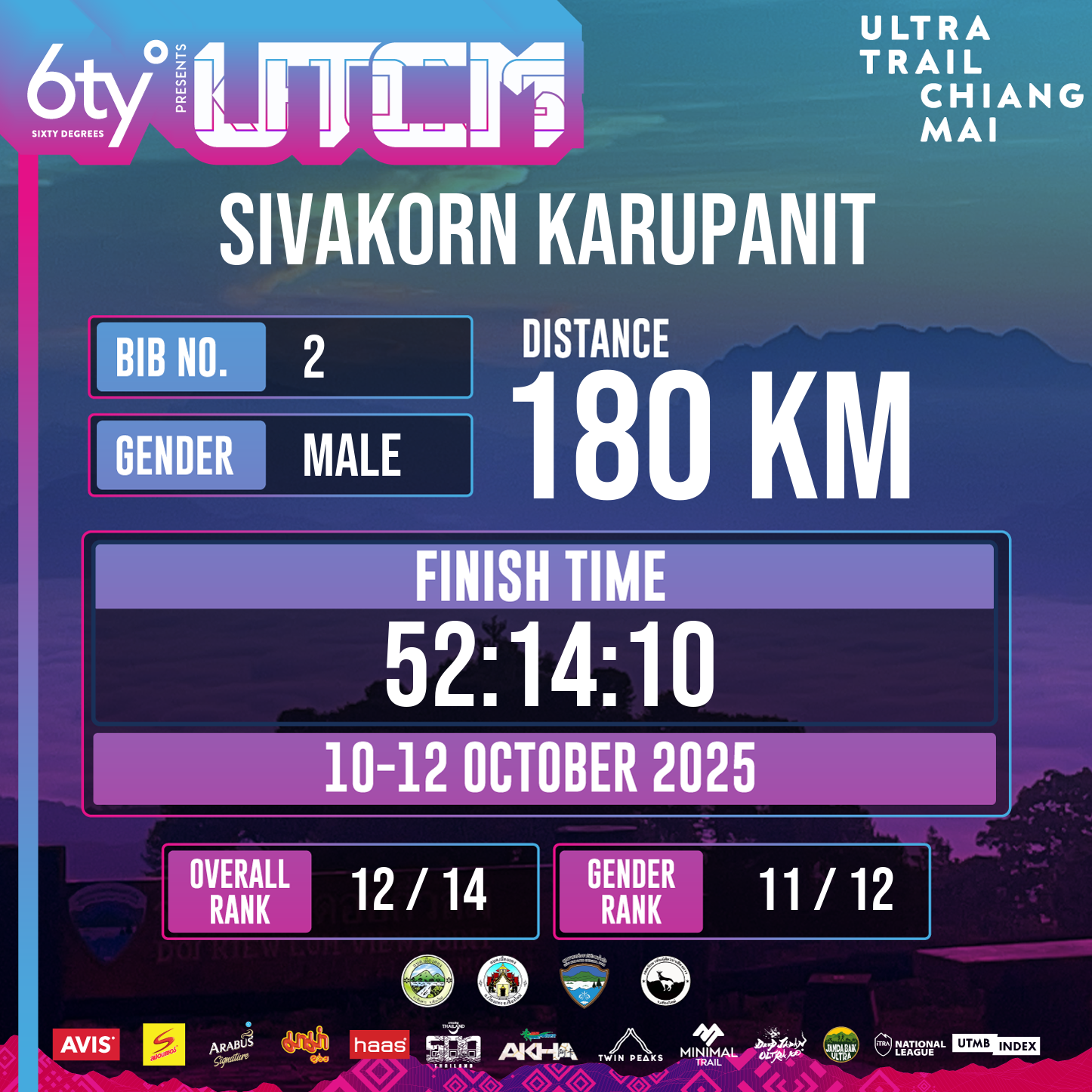 180 | 6:28:33 | 52:14:10 | 12 Oct 14:14:10 |