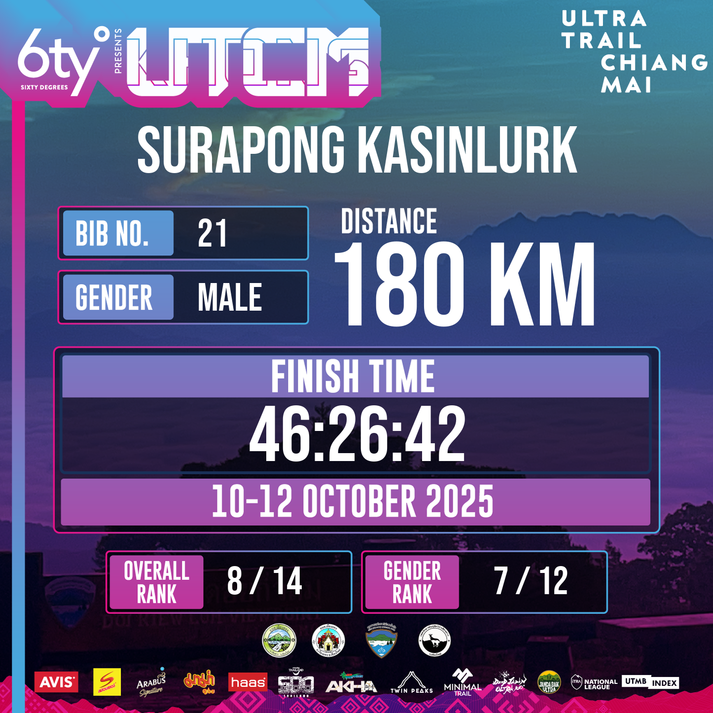 180 | 5:47:39 | 46:26:42 | 12 Oct 08:26:42 |